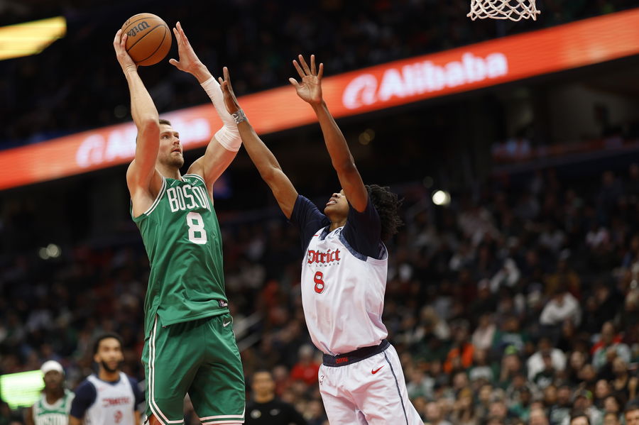 Dec 15, 2024; Washington, District of Columbia, USA; Boston Celtics center Kristaps Porzingis (8) shoots the ball as Washington Wizards guard Bub Carrington (8) defends in the second quarter at Capital One Arena. Mandatory Credit: Geoff Burke-Imagn Images