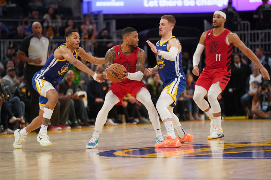 Dec 30, 2022; San Francisco, California, USA; Portland Trail Blazers guard Damian Lillard (0) is defended by Golden State Warriors guard Jordan Poole (3) and guard Donte DiVincenzo (0) in the fourth quarter at the Chase Center. Mandatory Credit: Cary Edmondson-USA TODAY Sports