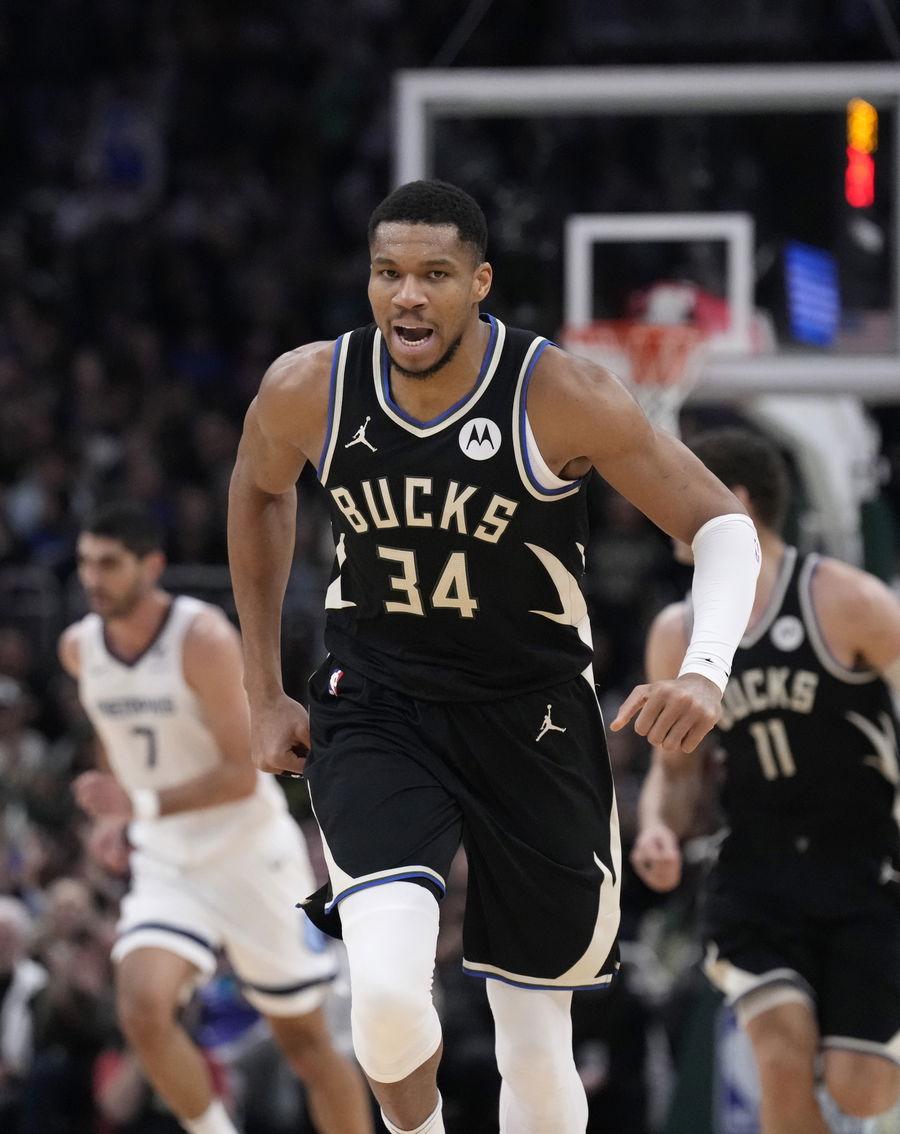 Feb 2, 2025; Milwaukee, Wisconsin, USA; Milwaukee Bucks forward Giannis Antetokounmpo (34) runs down the court after dunking the ball against the Memphis Grizzlies in the second half at Fiserv Forum. Mandatory Credit: Michael McLoone-Imagn Images