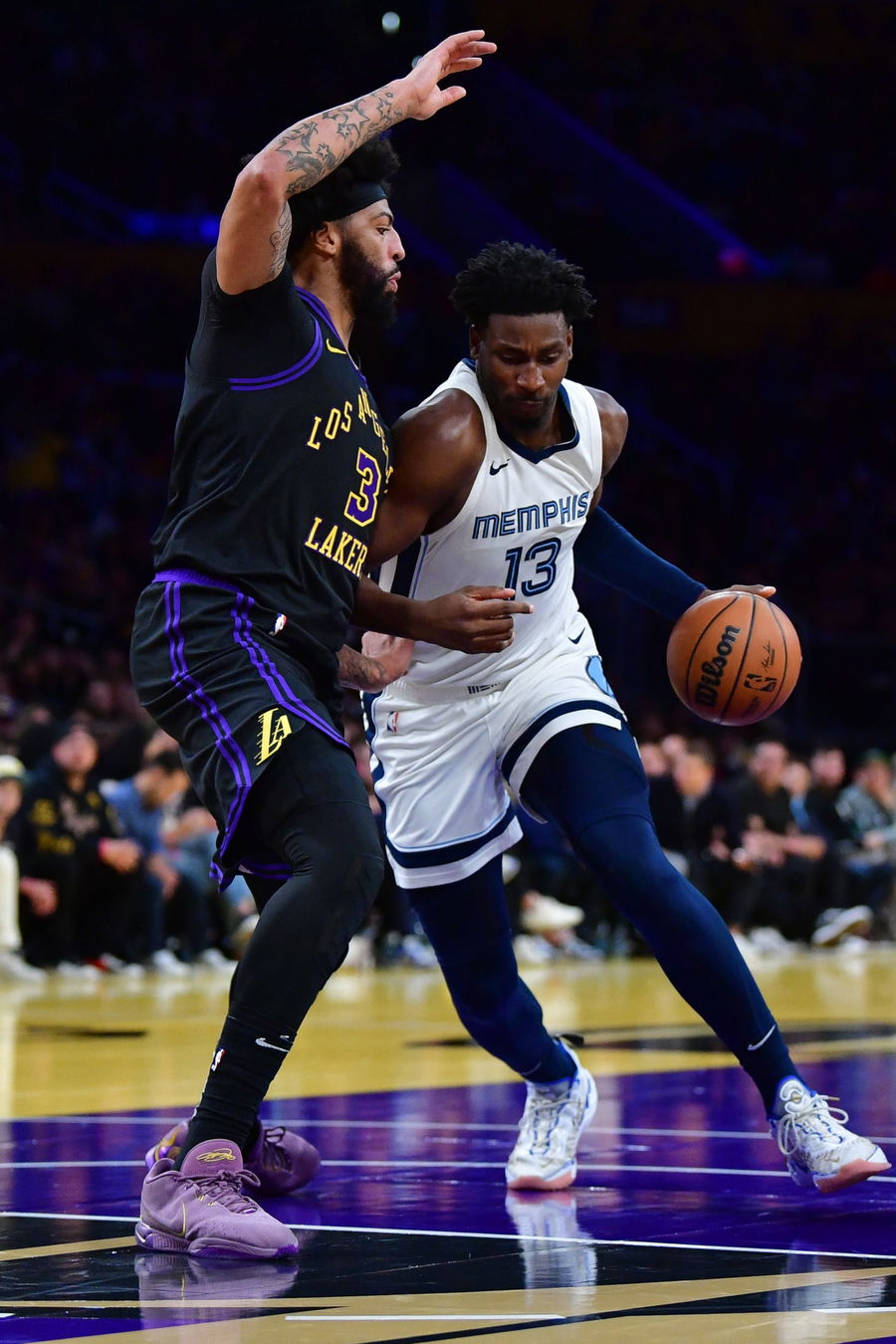 Nov 14, 2023; Los Angeles, California, USA; Memphis Grizzlies forward Jaren Jackson Jr. (13) moves to the basket against Los Angeles Lakers forward Anthony Davis (3) during the second half at Crypto.com Arena. Mandatory Credit: Gary A. Vasquez-USA TODAY Sports