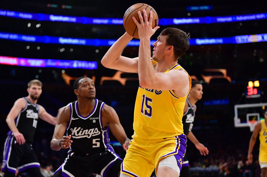 Mar 6, 2024; Los Angeles, California, USA; Los Angeles Lakers guard Austin Reaves (15) shoots against Sacramento Kings guard De’Aaron Fox (5) during the second half at Crypto.com Arena. Mandatory Credit: Gary A. Vasquez-USA TODAY Sports