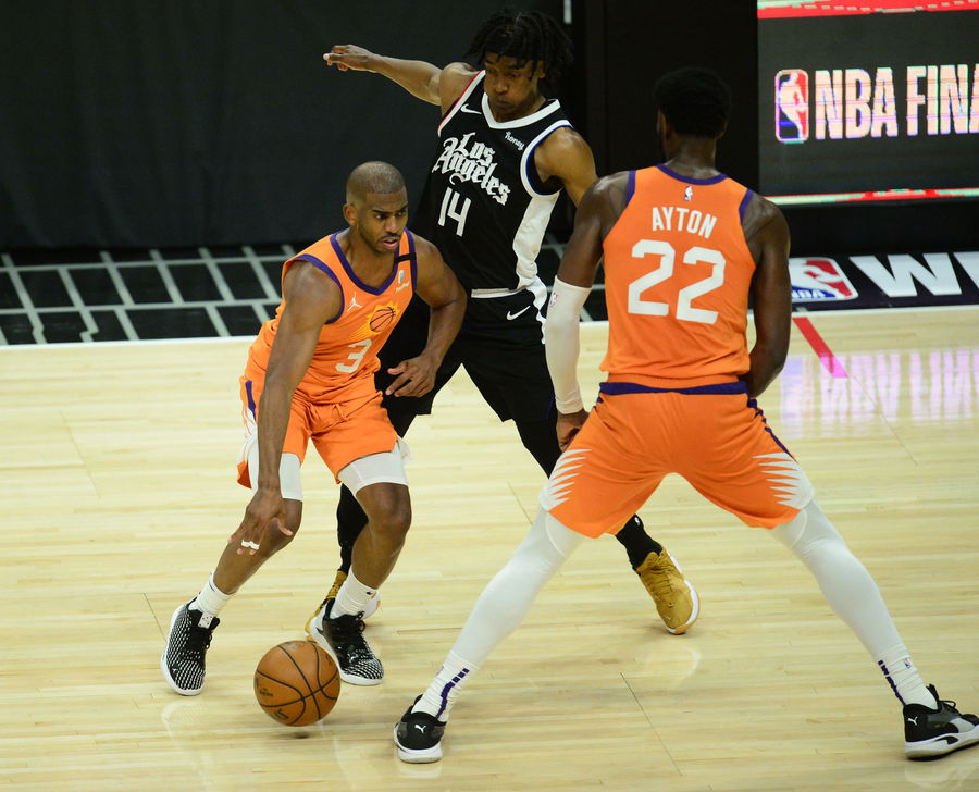 Jun 24, 2021; Los Angeles, California, USA; Phoenix Suns guard Chris Paul (3) moves the ball as center Deandre Ayton (22) provides coverage against Los Angeles Clippers guard Terance Mann (14) during the second half in game three of the Western Conference Finals for the 2021 NBA Playoffs at Staples Center. Mandatory Credit: Gary A. Vasquez-USA TODAY Sports