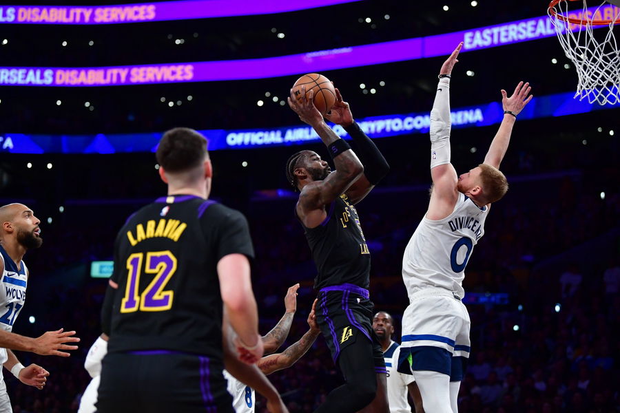 Mar 10, 2026; Los Angeles, California, USA; Los Angeles Lakers center Deandre Ayton (5) moves to the basket against Minnesota Timberwolves guard Donte DiVincenzo (0) during the first half at Crypto.com Arena. Mandatory Credit: Gary A. Vasquez-Imagn Images