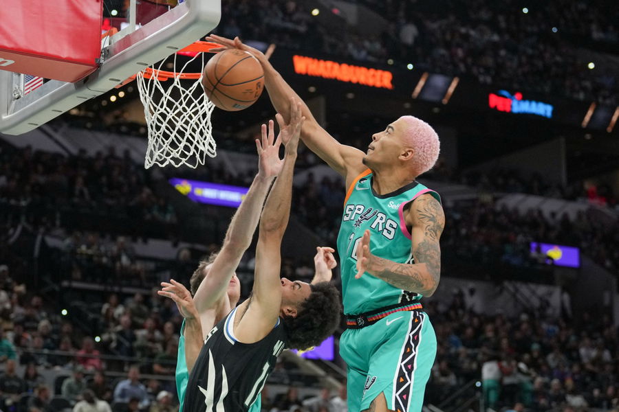 Nov 11, 2022; San Antonio, Texas, USA; San Antonio Spurs forward Jeremy Sochan (10) blocks a shot by Milwaukee Bucks forward Jordan Nwora (13) in the first half at the AT&T Center. Mandatory Credit: Daniel Dunn-USA TODAY Sports