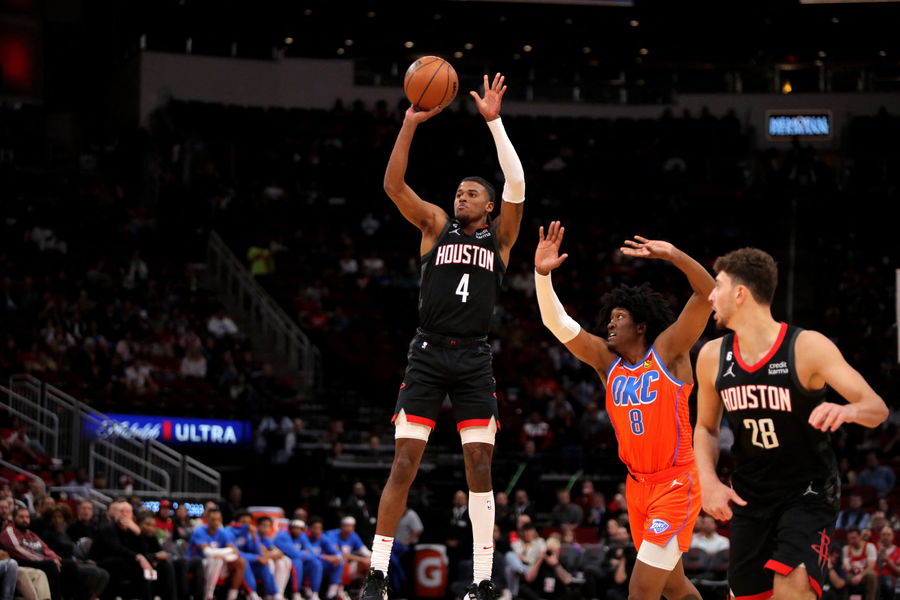 Nov 26, 2022; Houston, Texas, USA; Houston Rockets guard Jalen Green (4) takes an inside shot while Oklahoma City Thunder forward Jalen Williams (8) defends during the first quarter at Toyota Center. Mandatory Credit: Erik Williams-USA TODAY Sports