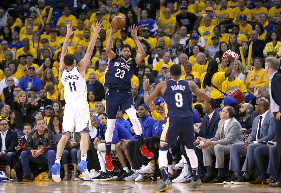 Apr 28, 2018; Oakland, CA, USA; New Orleans Pelicans forward Anthony Davis (23) saves the ball from going out of bounds next to Golden State Warriors guard Klay Thompson (11) in the third quarter in game one of the second round of the 2018 NBA Playoffs at Oracle Arena. Mandatory Credit: Cary Edmondson-USA TODAY Sports