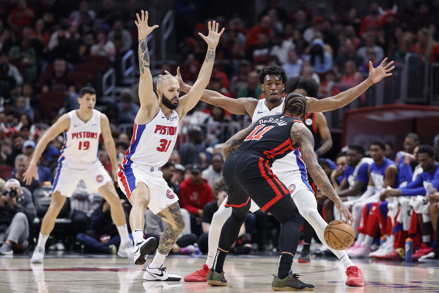 Feb 27, 2024; Chicago, Illinois, USA; Detroit Pistons guard Evan Fournier (31) and center James Wiseman (13) defend against Chicago Bulls forward DeMar DeRozan (11) during the first half at United Center. Mandatory Credit: Kamil Krzaczynski-USA TODAY Sports