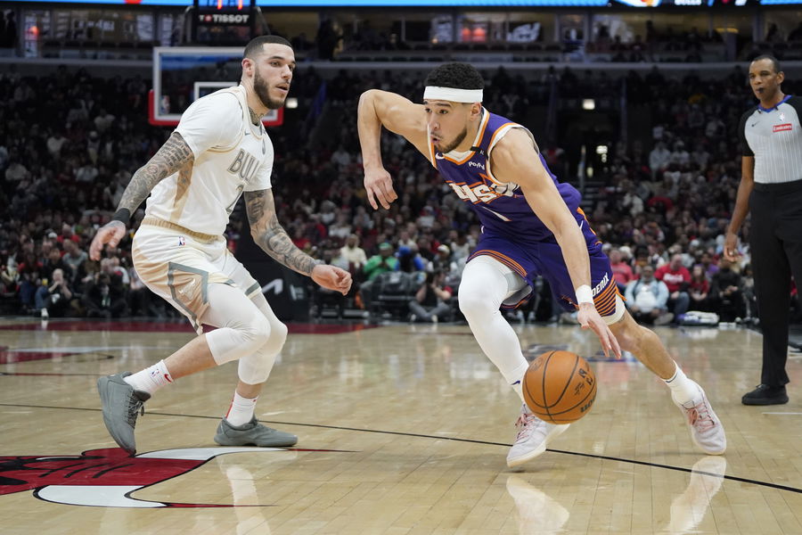 Feb 22, 2025; Chicago, Illinois, USA; Chicago Bulls guard Lonzo Ball (2) defends Phoenix Suns guard Devin Booker (1) during the first quarter at United Center. Mandatory Credit: David Banks-Imagn Images