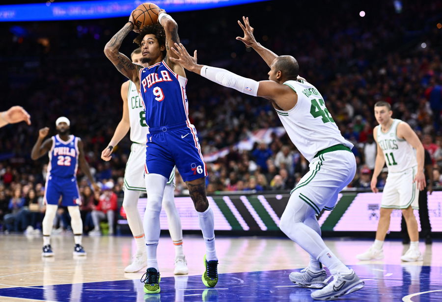 Nov 8, 2023; Philadelphia, Pennsylvania, USA; Philadelphia 76ers guard Kelly Oubre Jr (9) controls the ball against Boston Celtics center Al Horford (42) in the third quarter at Wells Fargo Center. Mandatory Credit: Kyle Ross-USA TODAY Sports