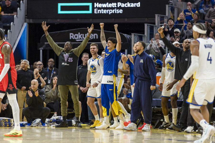 Dec 5, 2024; San Francisco, California, USA; Sidelined Golden State Warriors guard Stephen Curry (30) and forward Draymond Green (23) and other players on the bench react after a teammate scored against the Houston Rockets during the fourth quarter at Chase Center. Mandatory Credit: John Hefti-Imagn Images