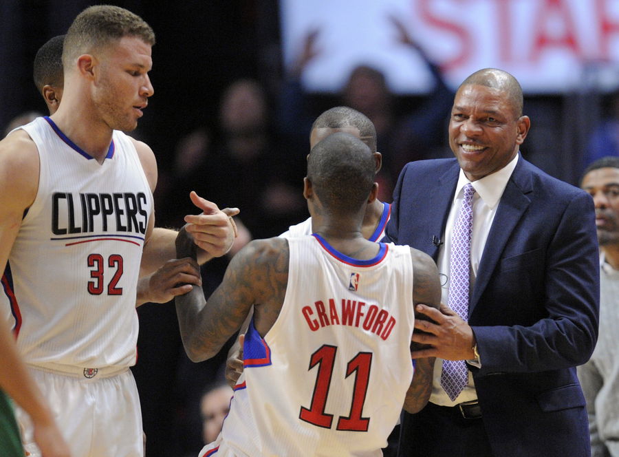 March 6, 2017; Los Angeles, CA, USA; Los Angeles Clippers head coach Doc Rivers and forward Blake Griffin (32) help up guard Jamal Crawford (11) after he scoes a three point basket and draws the foul against the Boston Celtics during the second half at Staples Center. Mandatory Credit: Gary A. Vasquez-USA TODAY Sports