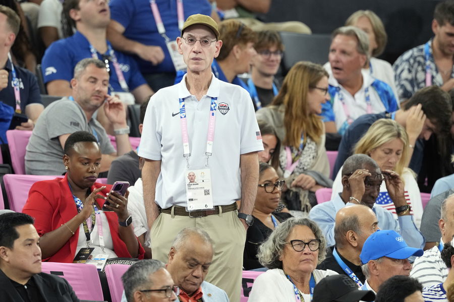 Aug 8, 2024; Paris, France; NBA commissioner Adam Silver looks on before the game between United States and Serbia in a men’s basketball semifinal game during the Paris 2024 Olympic Summer Games at Accor Arena. Mandatory Credit: Kyle Terada-USA TODAY Sports