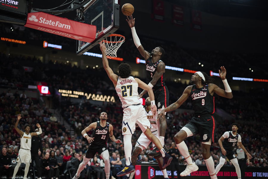 Dec 19, 2024; Portland, Oregon, USA; Denver Nuggets guard Jamal Murray (27) drives to the basket during the second half against Portland Trail Blazers center Deandre Ayton (2) and forward Jerami Grant (9) at Moda Center. Mandatory Credit: Troy Wayrynen-Imagn Images