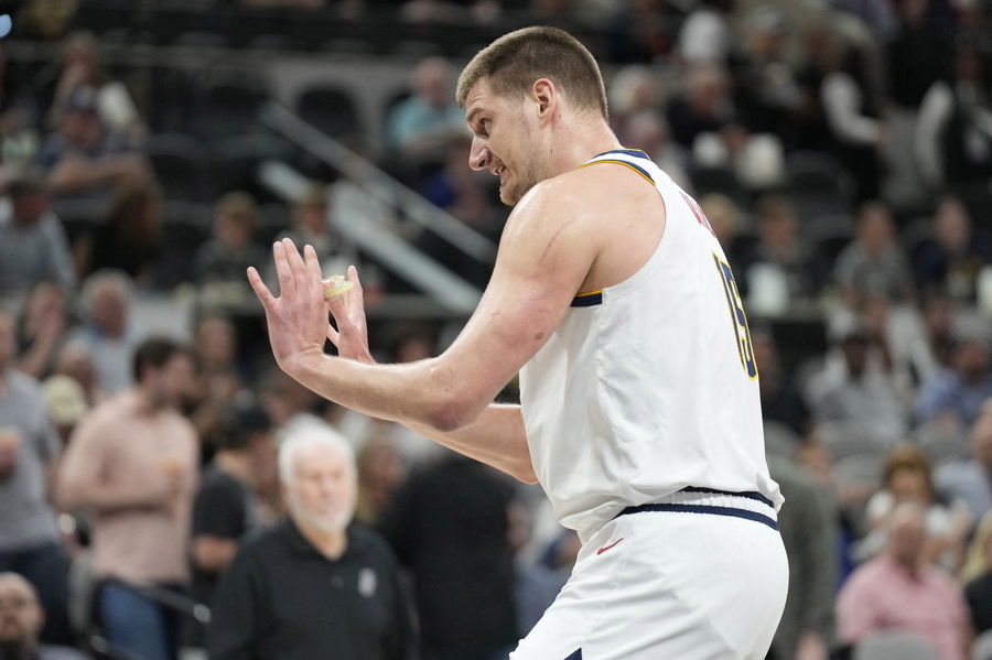 Apr 12, 2024; San Antonio, Texas, USA; Denver Nuggets center Nikola Jokic (15) signals to an official during the first half against the San Antonio Spurs at Frost Bank Center. Mandatory Credit: Scott Wachter-USA TODAY Sports