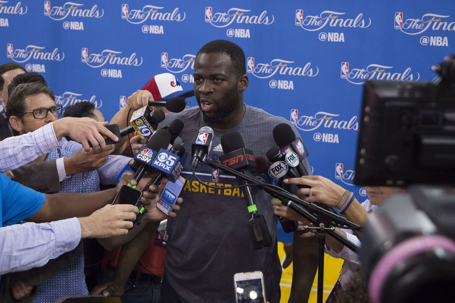 June 1, 2016; Oakland, CA, USA; Golden State Warriors forward Draymond Green (23) addresses the media in a press conference during NBA Finals media day at Oracle Arena. Mandatory Credit: Kyle Terada-USA TODAY Sports