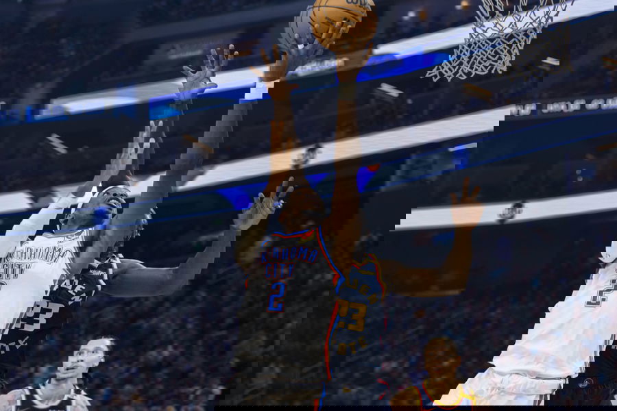 Nov 27, 2024; San Francisco, California, USA; Oklahoma City Thunder guard Shai Gilgeous-Alexander (2) shoots as Golden State Warriors forward Draymond Green (23) defends during the first half at Chase Center. Mandatory Credit: John Hefti-Imagn Images