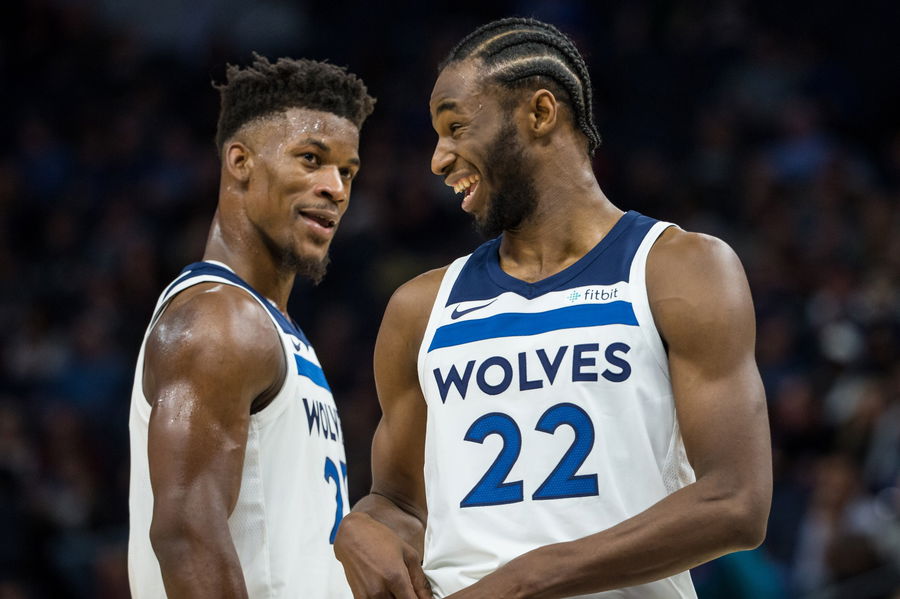 Nov 22, 2017; Minneapolis, MN, USA; Minnesota Timberwolves forward Andrew Wiggins (22) reacts with guard Jimmy Butler (23) during the third quarter against the Orlando Magic at Target Center. Mandatory Credit: Brace Hemmelgarn-USA TODAY Sports