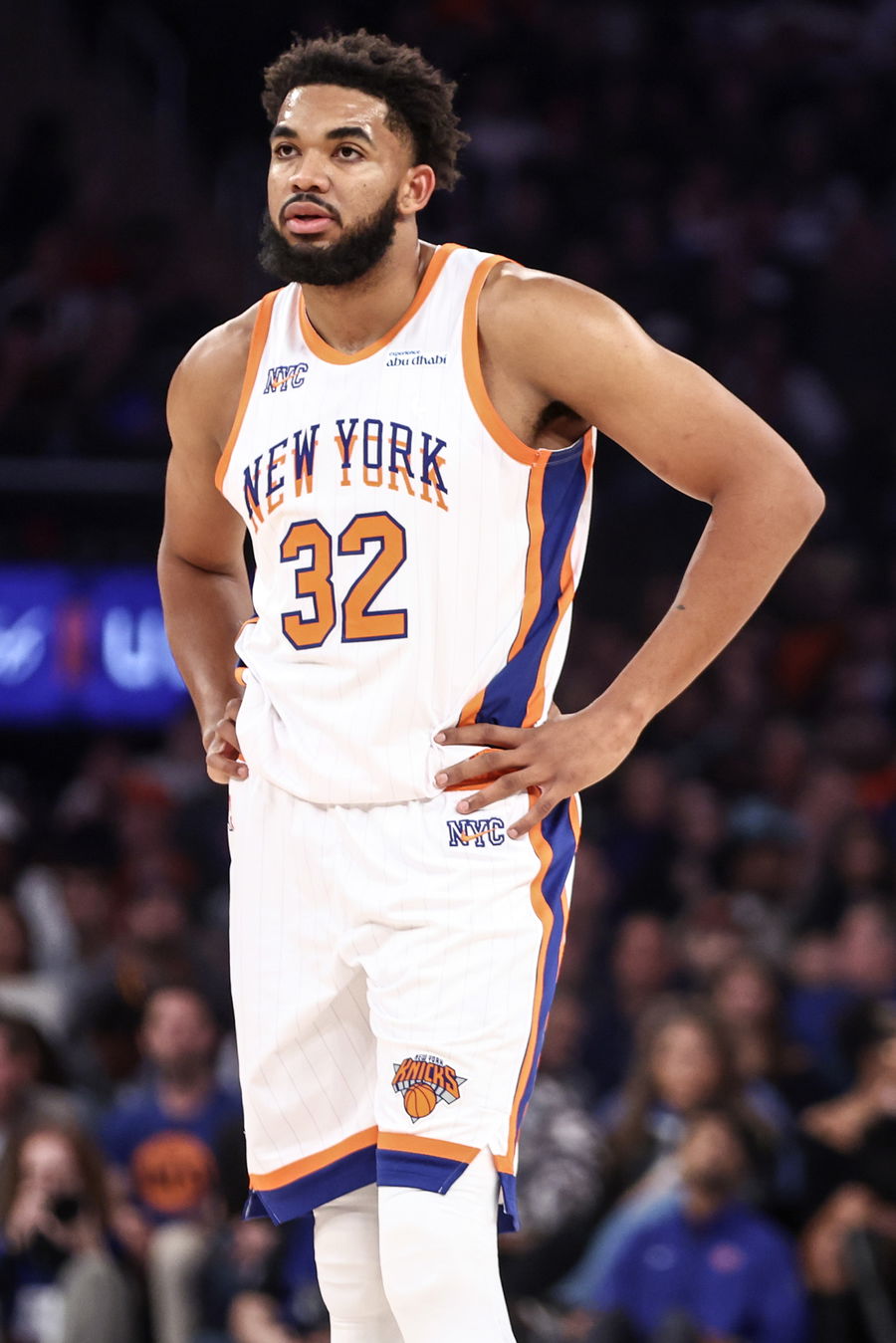 Nov 17, 2024; New York, New York, USA; New York Knicks center Karl-Anthony Towns (32) looks on after getting called for a flagrant foul in the first quarter against the Brooklyn Nets at Madison Square Garden. Mandatory Credit: Wendell Cruz-Imagn Images