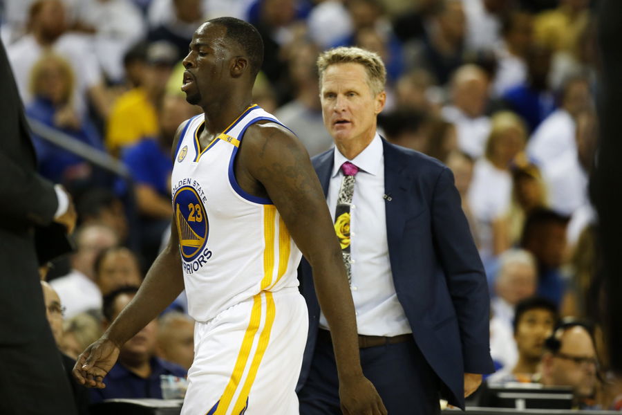 Golden State Warriors head coach Steve Kerr stares on Draymond Green (23) as he heads back to the bench during the first half of their opening night game against the San Antonio Spurs at Oracle Arena in Oakland, Calif., on Tuesday, Oct. 25, 2016. (Ray Chavez/Bay Area News Group)