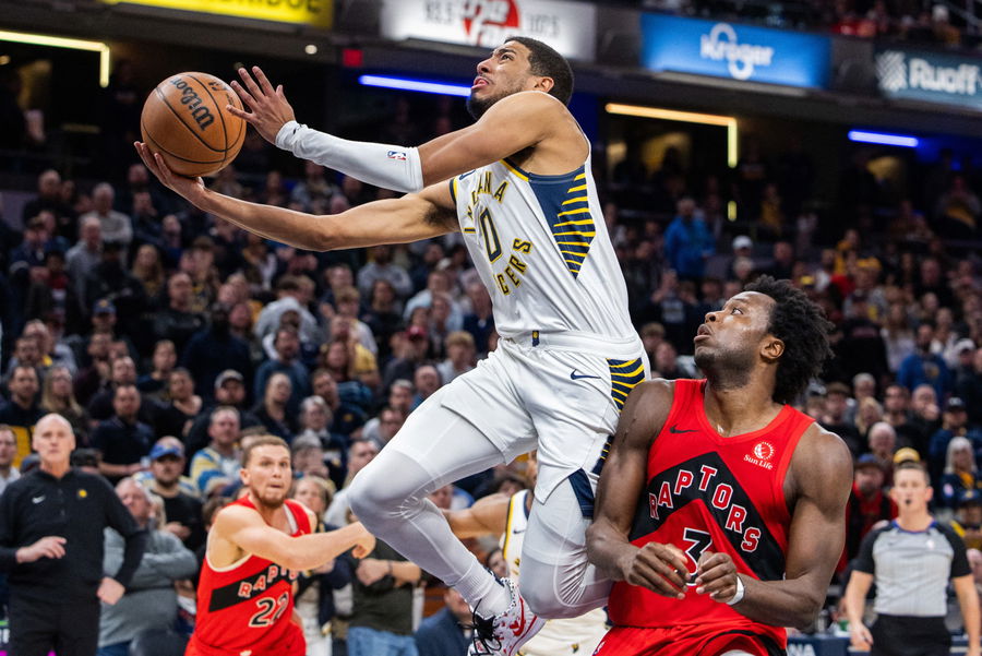 Nov 22, 2023; Indianapolis, Indiana, USA; Indiana Pacers guard Tyrese Haliburton (0) shoots the ball while Toronto Raptors forward O.G. Anunoby (3) defends in the second half at Gainbridge Fieldhouse. Mandatory Credit: Trevor Ruszkowski-USA TODAY Sports