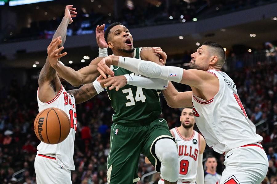 Nov 20, 2024; Milwaukee, Wisconsin, USA; Milwaukee Bucks forward Giannis Antetokounmpo (34) loses the ball while under pressure from Chicago Bulls center Nikola Vucevic (9) and forward Torrey Craig (13) in the fourth quarter at Fiserv Forum. Mandatory Credit: Benny Sieu-Imagn Images