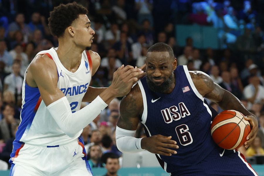 Paris 2024 Olympics – Basketball – Men’s Gold Medal Game – France vs United States – Bercy Arena, Paris, France – August 10, 2024. Victor Wembanyama of France in action against Lebron James of United States. REUTERS/Evelyn Hockstein