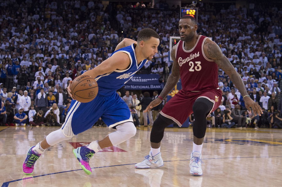 December 25, 2015; Oakland, CA, USA; Golden State Warriors guard Stephen Curry (30, left) dribbles the basketball against Cleveland Cavaliers forward LeBron James (23) in the fourth quarter of a NBA basketball game on Christmas at Oracle Arena. The Warriors defeated the Cavaliers 89-83. Mandatory Credit: Kyle Terada-USA TODAY Sports