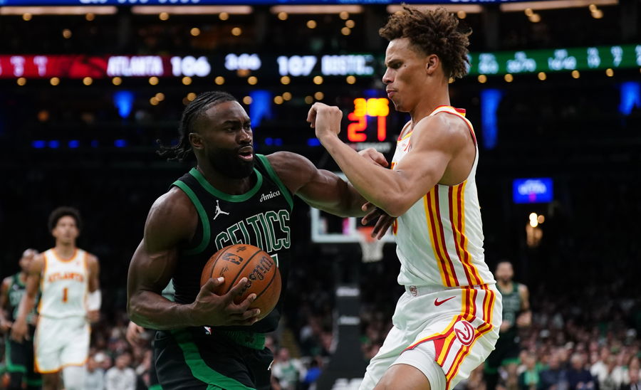 Nov 12, 2024; Boston, Massachusetts, USA; Boston Celtics guard Jaylen Brown (7) drives the ball against Atlanta Hawks guard Dyson Daniels (5) in the second half at TD Garden. Mandatory Credit: David Butler II-Imagn Images