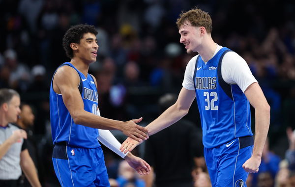 Dec 3, 2025; Dallas, Texas, USA; Dallas Mavericks forward Cooper Flagg (32) celebrates with Dallas Mavericks guard Max Christie (00) after scoring during the fourth quarter against the Miami Heat at American Airlines Center. Mandatory Credit: Kevin Jairaj-Imagn Images