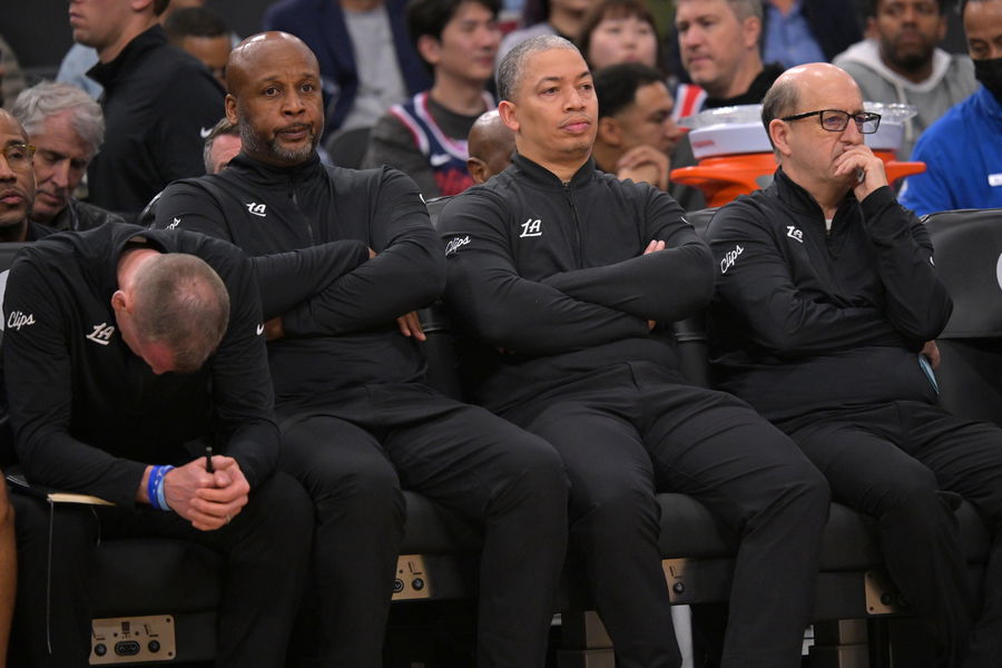 Feb 6, 2025; Inglewood, California, USA; From left; Los Angeles Clippers assistant coach Jay Larranaga, assistant coach Brian Shaw, head coach Tyronn Lue and lead assistant coach Jeff Van Gundy look on from the bench in the final seconds of the game against the Indiana Pacers at Intuit Dome. Mandatory Credit: Jayne Kamin-Oncea-Imagn Images