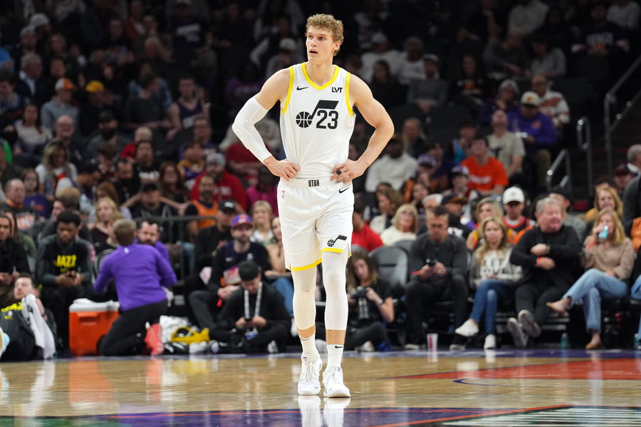 Jan 11, 2025; Phoenix, Arizona, USA; Utah Jazz forward Lauri Markkanen (23) looks on against the Phoenix Suns during the first half at Footprint Center. Mandatory Credit: Joe Camporeale-Imagn Images