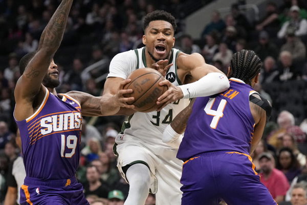 Mar 10, 2026; Milwaukee, Wisconsin, USA; Milwaukee Bucks forward Giannis Antetokounmpo (34) drives for the basket between Phoenix Suns forward Haywood Highsmith (19) and guard Jalen Green (4) during the second quarter at Fiserv Forum. Mandatory Credit: Jeff Hanisch-Imagn Images