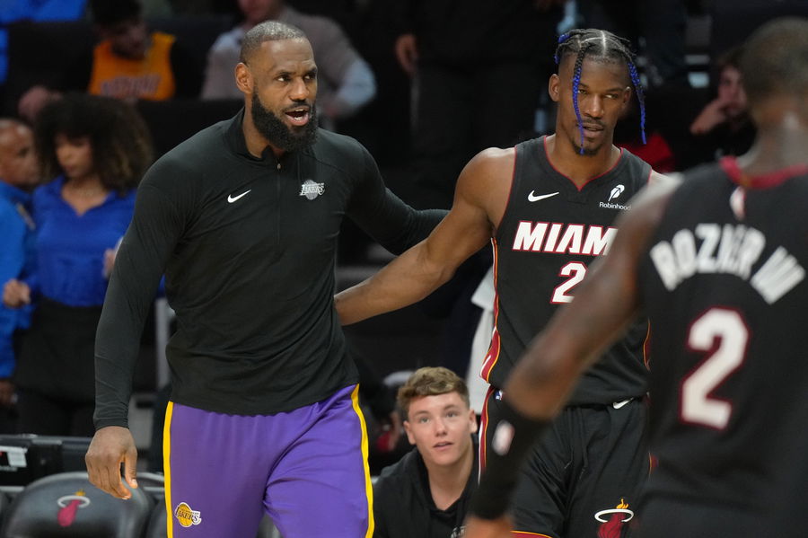 Dec 4, 2024; Miami, Florida, USA; Los Angeles Lakers forward LeBron James (23) and Miami Heat forward Jimmy Butler (22) greet each other following the game at the Kaseya Center. Mandatory Credit: Jim Rassol-Imagn Images