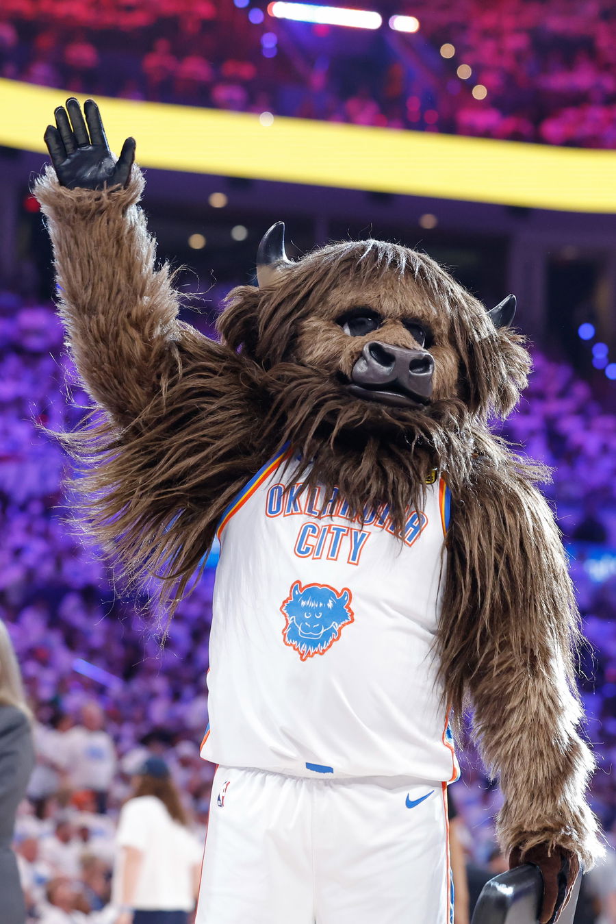 May 20, 2025; Oklahoma City, Oklahoma, USA; Oklahoma City Thunder mascot, Rumble the Bison, pumps up the fans in the fourth quarter during game one of the western conference finals for the 2025 NBA Playoffs at Paycom Center. Mandatory Credit: Alonzo Adams-Imagn Images
