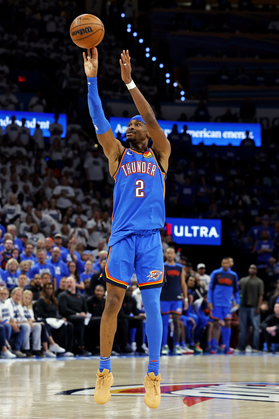 May 28, 2025; Oklahoma City, Oklahoma, USA; Oklahoma City Thunder guard Shai Gilgeous-Alexander (2) shoots the ball during the fourth quarter against the Minnesota Timberwolves in game five of the western conference finals for the 2025 NBA Playoffs at Paycom Center. Mandatory Credit: Alonzo Adams-Imagn Images