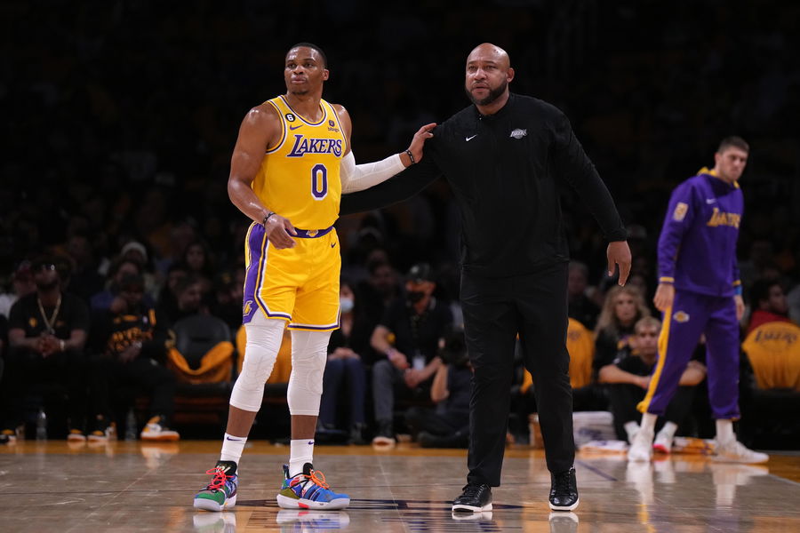 Oct 20, 2022; Los Angeles, California, USA; Los Angeles Lakers guard Russell Westbrook (0) and coach Darvin Ham react in the first half against the LA Clippers at Crypto.com Arena. Mandatory Credit: Kirby Lee-USA TODAY Sports