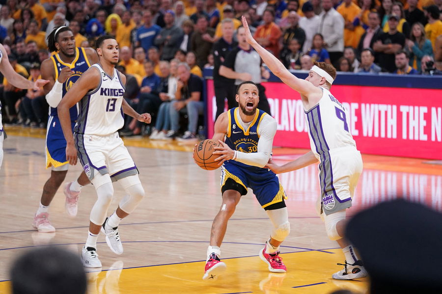 Apr 28, 2023; San Francisco, California, USA; Golden State Warriors guard Stephen Curry (30) drives to the basket next to Sacramento Kings guard Kevin Huerter (9) in the fourth quarter during game six of the 2023 NBA playoffs at the Chase Center. Mandatory Credit: Cary Edmondson-USA TODAY Sports