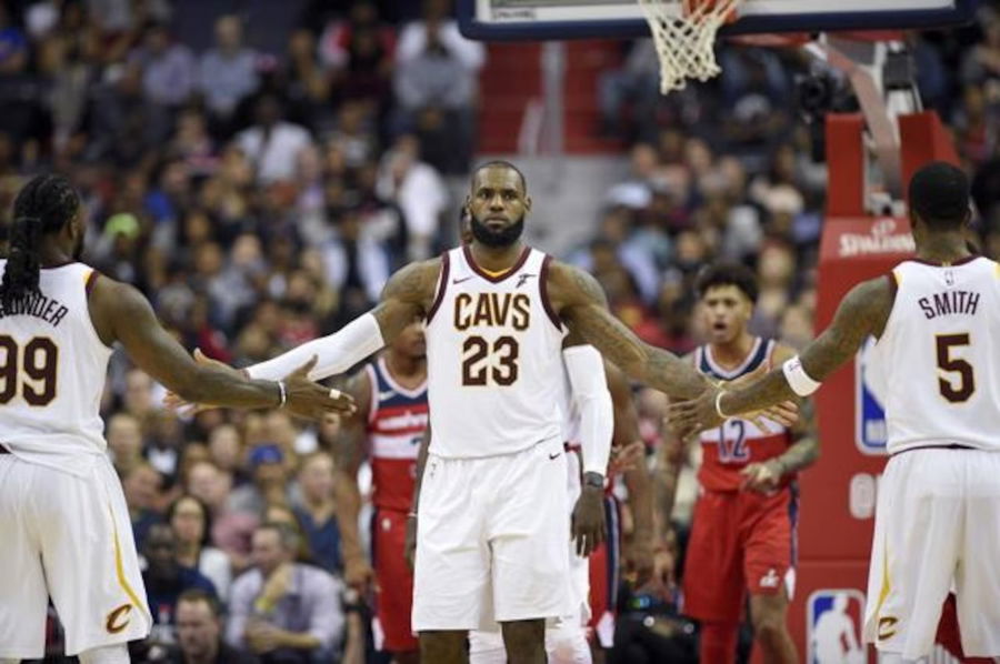Cleveland Cavaliers forward LeBron James (23) slaps hands with forward Jae Crowder (99) and guard JR Smith (5) after he was fouled during the second half of an NBA basketball game against the Washington Wizards, Friday, Nov. 3, 2017, in Washington.