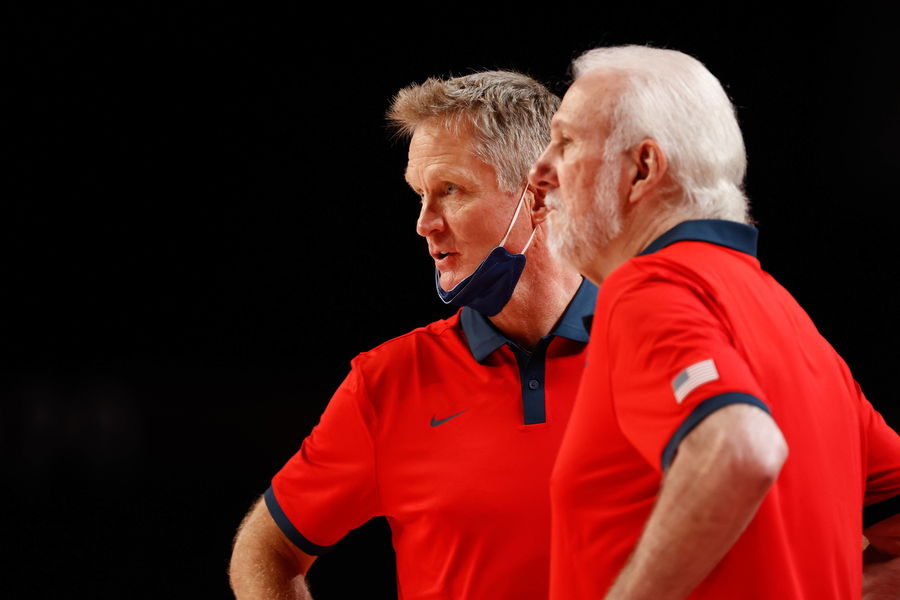July 31, 2021, Tokyo, Kanto, Japan: USA Coaches Gregg Popovich and Steve Kerr during their team 119-84 win over the Czech Republic, leading the Americans into theCoaches Steve Curr an quarterfinals of the Olympic men s basketball tournament. in the Tokyo Olympics 2020. Tokyo Japan – ZUMAk13_ 20210731_zap_k13_008 Copyright: xPaulxKurodax