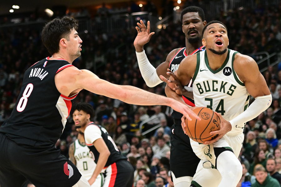 Jan 4, 2025; Milwaukee, Wisconsin, USA; Milwaukee Bucks forward Giannis Antetokounmpo (34) looks for a shot against Portland Trail Blazers forward Deni Avdija (8) and center Deandre Ayton (2) in the fourth quarter at Fiserv Forum. Mandatory Credit: Benny Sieu-Imagn Images