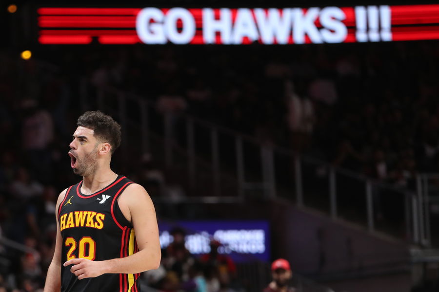 Mar 12, 2025; Atlanta, Georgia, USA; Atlanta Hawks forward Georges Niang (20) reacts to a three-point basket against the Charlotte Hornets during the second half at State Farm Arena. Mandatory Credit: Mady Mertens-Imagn Images