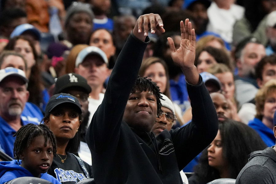 Grizzlies player GG Jackson mimes shooting the ball as he watches the game between UNC and Memphis in the Hoops for St. Jude Tip Off Classic at FedExForum on Tuesday, October 15, 2024.