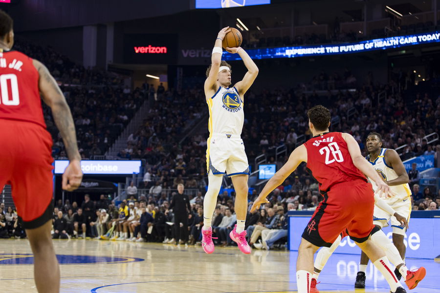 Dec 5, 2024; San Francisco, California, USA; Golden State Warriors guard Brandin Podziemski (2) shoots against the Houston Rockets during the second quarter at Chase Center. Mandatory Credit: John Hefti-Imagn Images
