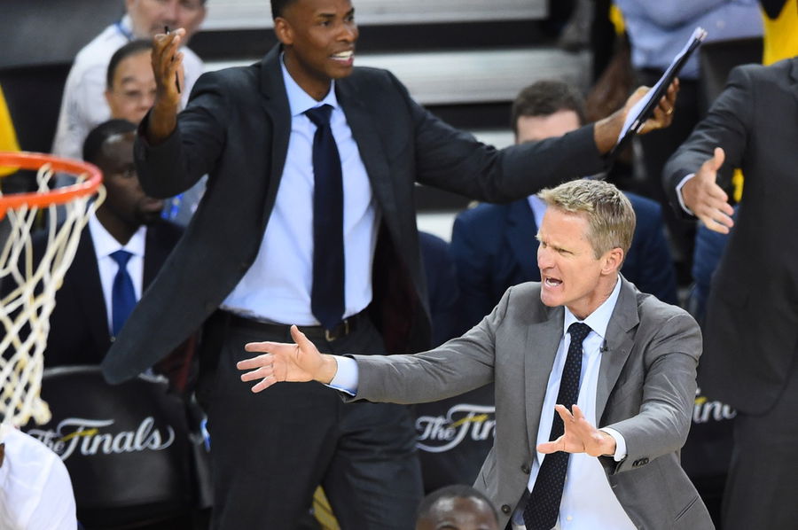June 2, 2016; Oakland, CA, USA; Golden State Warriors head coach Steve Kerr reacts in the second half in game one of the NBA Finals at Oracle Arena. Mandatory Credit: Bob Donnan-USA TODAY Sports