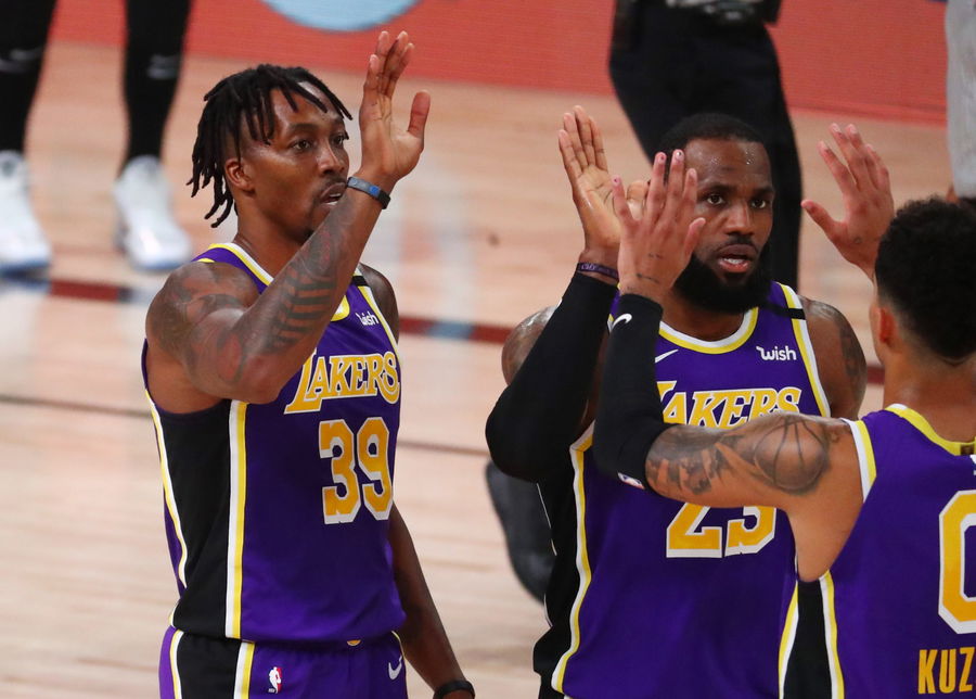 Sep 26, 2020; Lake Buena Vista, Florida, USA; Los Angeles Lakers players Dwight Howard (39), LeBron James (23) and Kyle Kuzma (0) celebrate against the Denver Nuggets during the first half in game five of the Western Conference Finals of the 2020 NBA Playoffs at AdventHealth Arena. Mandatory Credit: Kim Klement-USA TODAY Sports