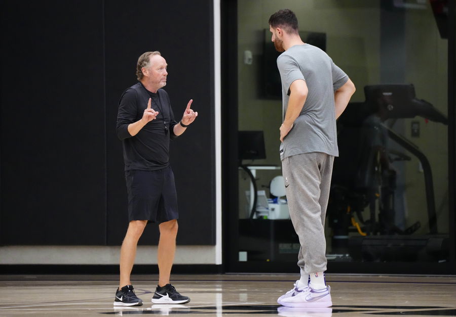 Suns head coach Mike Budenholzer talks to center Jusuf Nurkic during practice at the Verizon 5G Performance Center in Phoenix on Oct. 1, 2024.