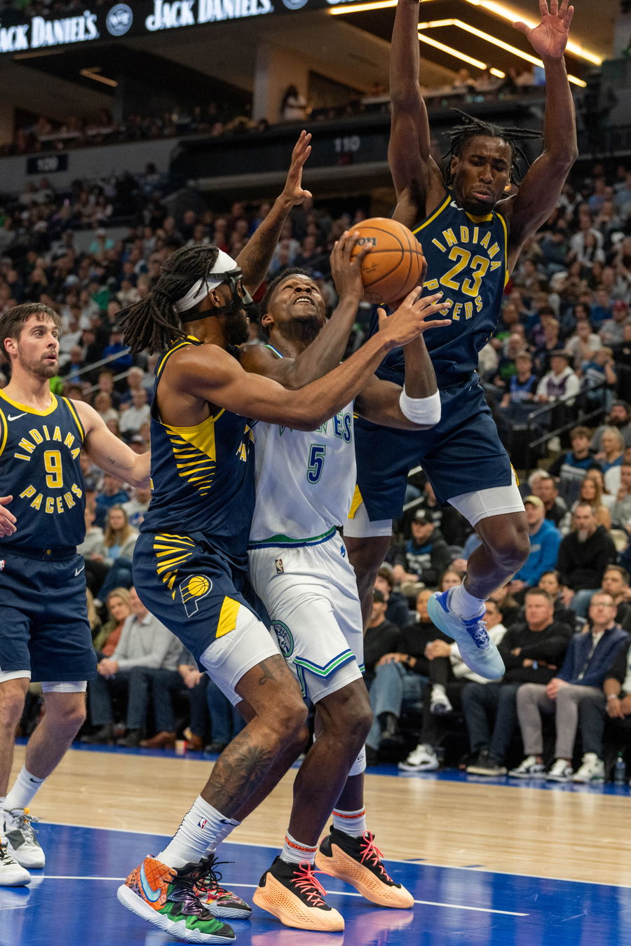 Dec 16, 2023; Minneapolis, Minnesota, USA; Minnesota Timberwolves guard Anthony Edwards (5) is fouled by Indiana Pacers forward Isaiah Jackson (22) as forward Aaron Nesmith (23) defeds in the second quarter at Target Center. Mandatory Credit: Matt Blewett-USA TODAY Sports