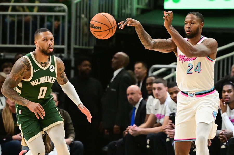 Jan 23, 2025; Milwaukee, Wisconsin, USA; Miami Heat forward Haywood Highsmith (24) passes the ball away from Milwaukee Bucks guard Damian Lillard (0) in the first quarter at Fiserv Forum. Mandatory Credit: Benny Sieu-Imagn Images
