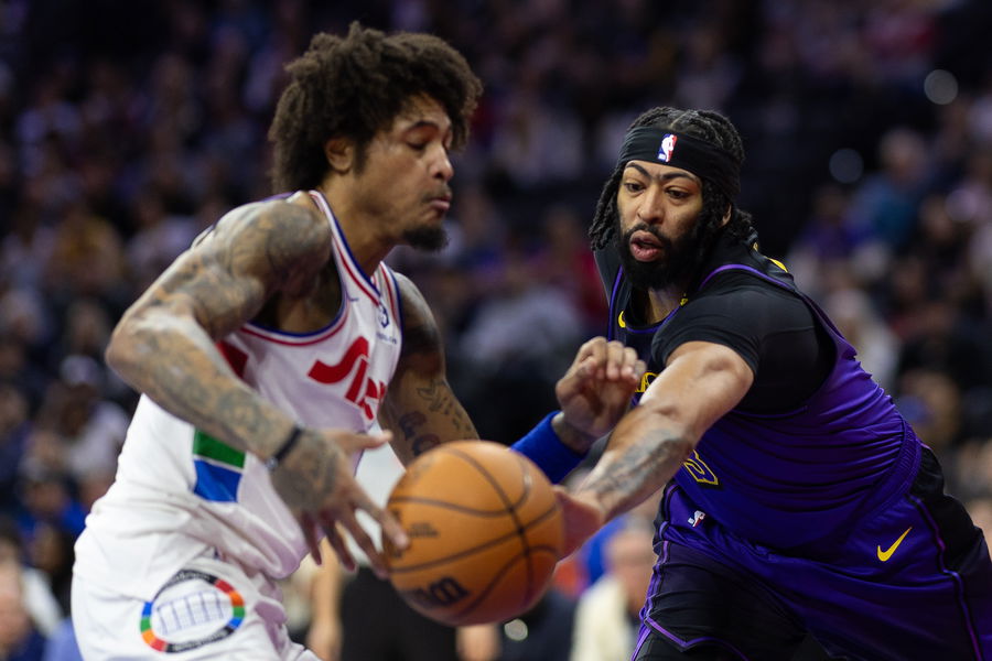 Jan 28, 2025; Philadelphia, Pennsylvania, USA; Los Angeles Lakers forward Anthony Davis (3) knocks the ball from Philadelphia 76ers guard Kelly Oubre Jr. (9) during the first quarter at Wells Fargo Center. Mandatory Credit: Bill Streicher-Imagn Images