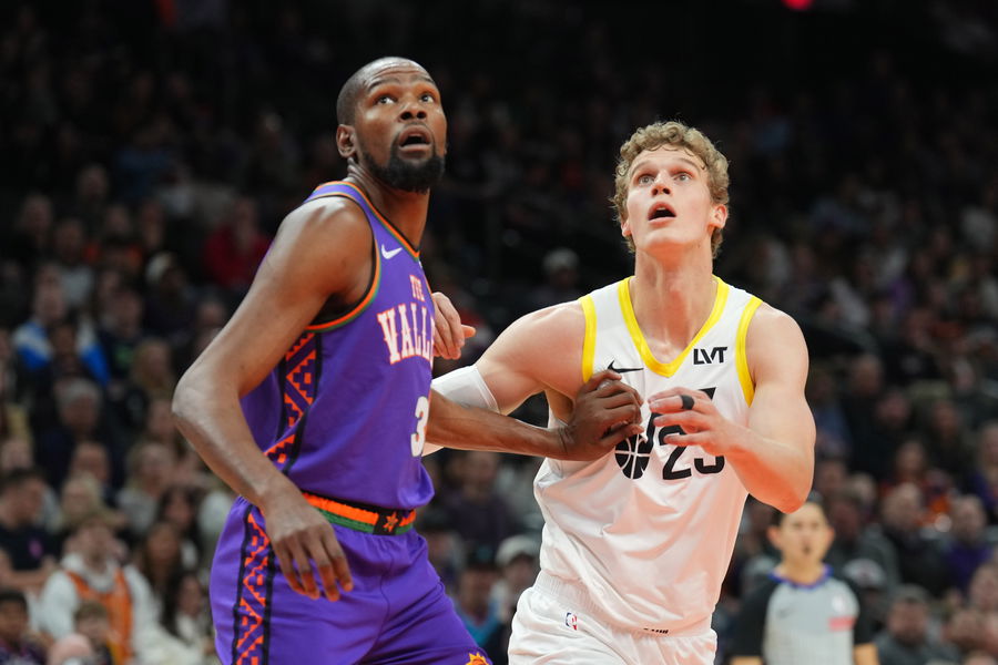 Jan 11, 2025; Phoenix, Arizona, USA; Utah Jazz forward Lauri Markkanen (23) and Phoenix Suns forward Kevin Durant (35) battle for position during the first half at Footprint Center. Mandatory Credit: Joe Camporeale-Imagn Images